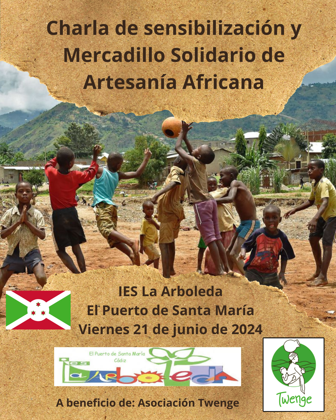 ✨ En primer lugar, el todo alumnado del centro recibirá unas charlas de concienciación y sensibilización sobre la cultura y la realidad de la sociedad burundesa actual y las dificultades a las que se enfrentan cada día. Posteriormente, se instalará un mercadillo solidario de artesanía africana elaborada por las costureras locales de la provincia de Ngozi (Burundi), cuya totalidad de la recaudación será destinada a la financiación de proyectos solidarios en la aldea batwa de Gatonde 🇧🇮